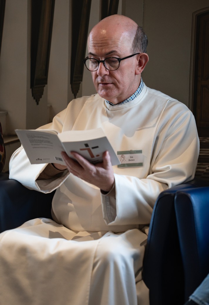 Wanneer pater Jos Bielen vraagt: ‘Wie van jullie heeft deze week nog snel wat dagen ingehaald?’ gaan vijf handen schoorvoetend omhoog. Vanuit de kring klinkt gelach van herkenning. In het afgelopen jaar hebben ze allemaal wel eens achtergelopen. Toch zitten ze nu allemaal hier, tijdens de slotdag van ‘De Bijbel in een Jaar’.