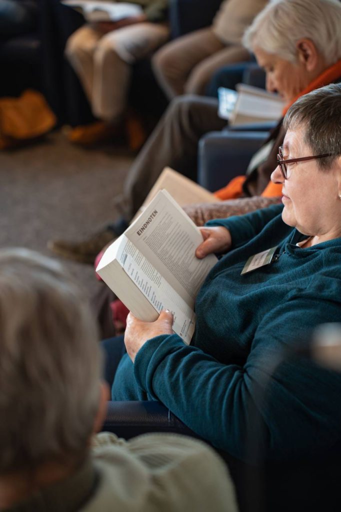 Deelneemster Greet combineerde het lezen met luisteren naar de podcast. ‘Mijn gedachten springen vaak alle kanten op. Door mee te lezen met de podcast, bleef ik bij de les. Het was ook meer dan alleen lezen: het was lezen en bidden tegelijk. In de stilte luister je naar de Bijbel, maar ook: wat zegt God hierdoor tot mij? Op die manier is het eigenlijk een retraite van een jaar geweest.’