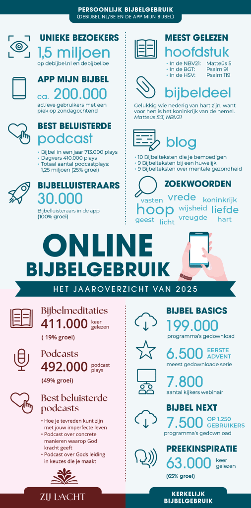Voor het eerst zijn ook gegevens over het digitale Bijbelgebruik van vrouwenplatform Zij Lacht meegenomen in het jaaroverzicht. Het aantal gelezen Bijbelmeditaties groeide dit jaar met 19% naar 411.000, met als topper die over Gods aanwezigheid. Maar vooral de sterke groei van luisteren valt op: het aantal podcastplays steeg met 49% naar 492.000. Het best beluisterd werden de podcasts over identiteit (‘Hoe je tevreden kunt zijn met jouw imperfecte leven’), over hoe God kracht geeft, en over Gods leiding bij keuzes maken. Dit laat zien dat vrouwen in de Bijbel zoeken naar bemoediging, praktische geloofshandvatten en richting.