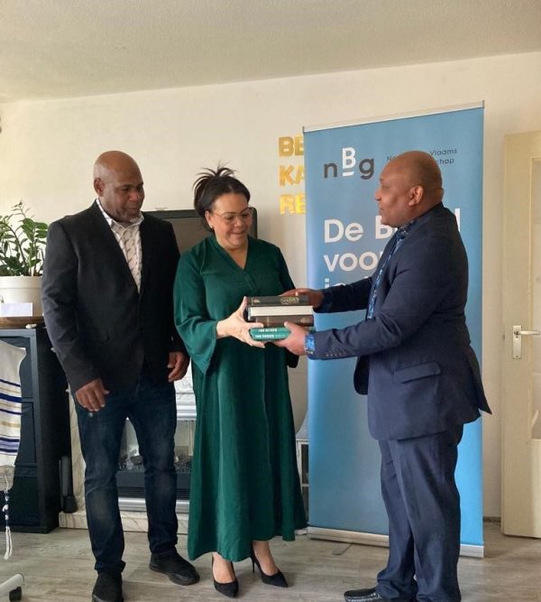 Samuel Ekpo, Relatiebeheerder Migranten- en Internationale Kerken bij het NBG, overhandigde de Bijbels. ‘Het is onze missie dat iedereen de Bijbel kan lezen in de taal van zijn hart’, zegt Ekpo. ‘We willen in alle kerken, groot of klein, betrokkenheid bij dat boek bevorderen. Daarom bezoeken we migrantenkerken om Bijbels beschikbaar te stellen. In de afgelopen maanden waren we in Almere, Amsterdam, Zwolle en Venlo.’ Leden van deze kerken kunnen via het NBG aan Bijbels komen in de bovengenoemde talen en in het Twi en Farsi; kinderbijbels zijn verkrijgbaar in het Engels, Spaans, Oekraïens, Portugees, Papiamentu, Papiamento en Russisch.